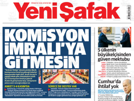 “Terörsüz Türkiye” sürecini yürüten Meclis komisyonunun İmralı’ya gideceği haberleri kamuoyundan tepki çekti. Areda Survey’in yaptığı ankete göre vatandaşların yüzde 76,7’si komisyonun İmralı’ya giderek Öcalan ile görüşmesine karşı. Görüşmenin sürece zarar vereceği endişesi var.”
